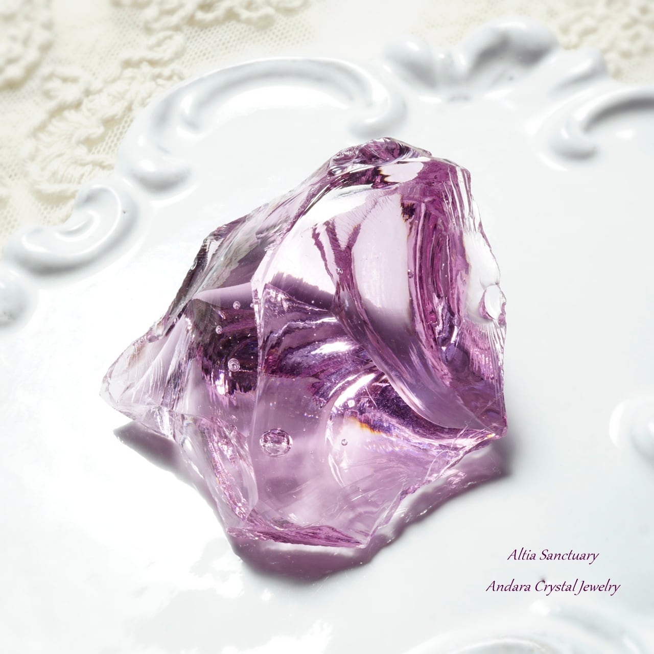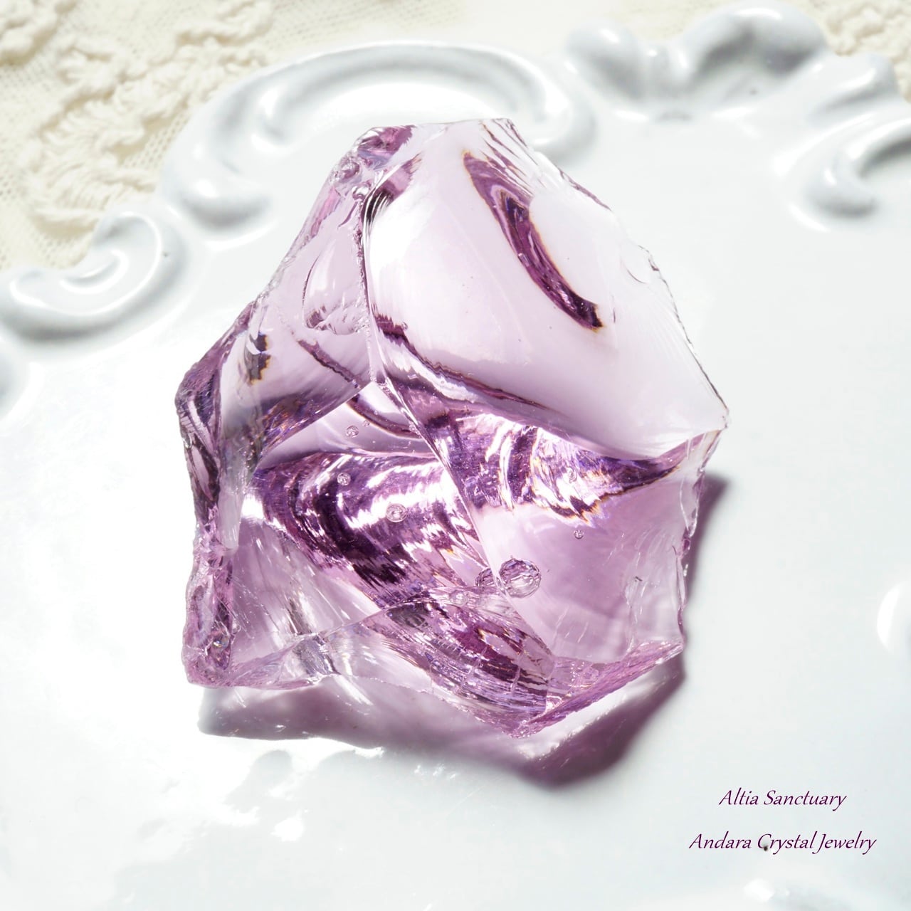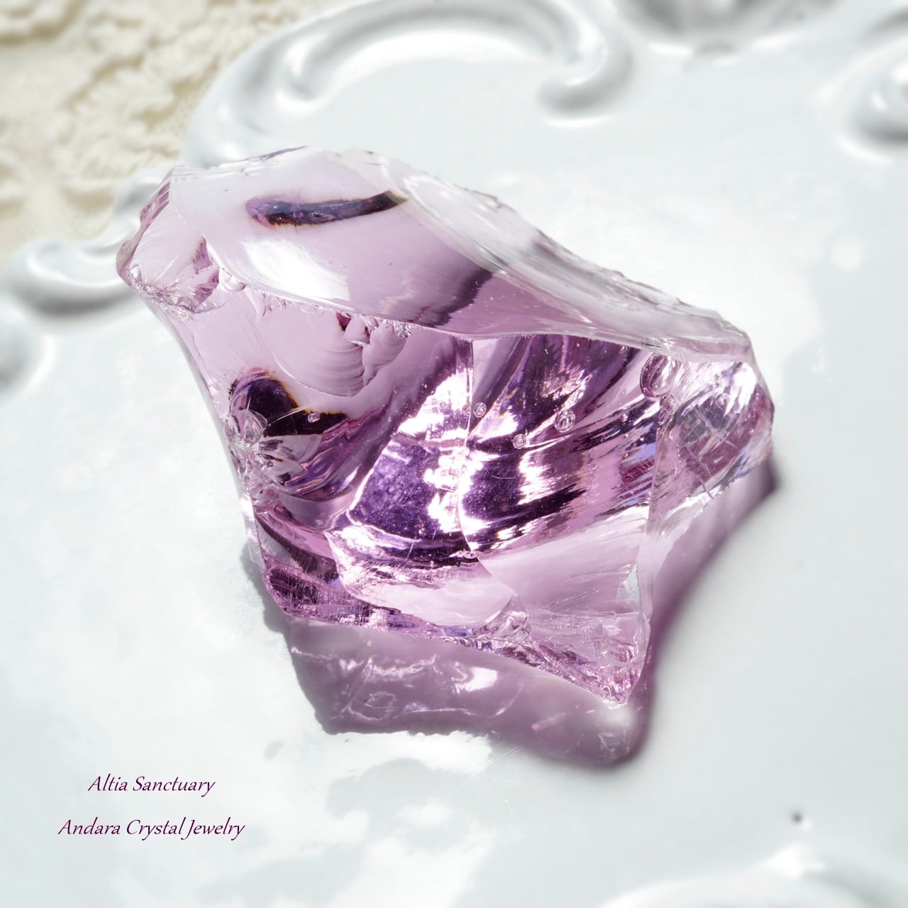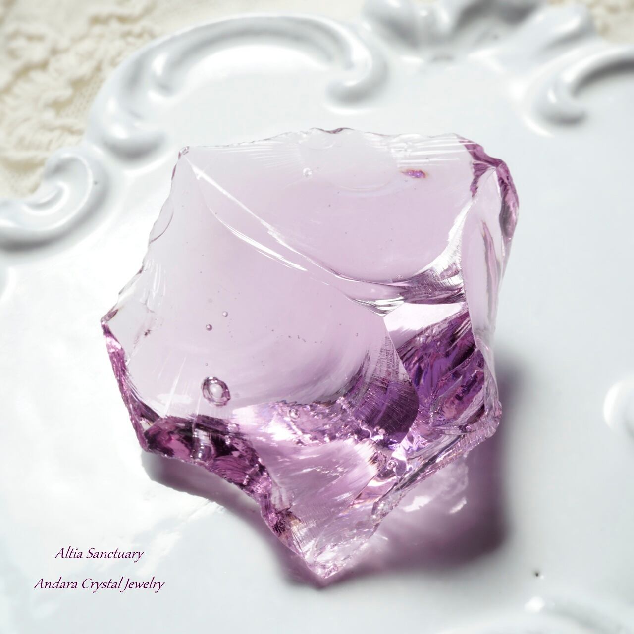ローズの花びらのような優美なアンダラクリスタル「Rose de France」です。こちらのローズ ド フランスは、艶・照り・厚みがあり、アメジストピンクのフレッシュな煌めきを放つ可憐で美しいアンダラクリスタルです。インクルージョンの小さな気泡もキュートなポイントです。