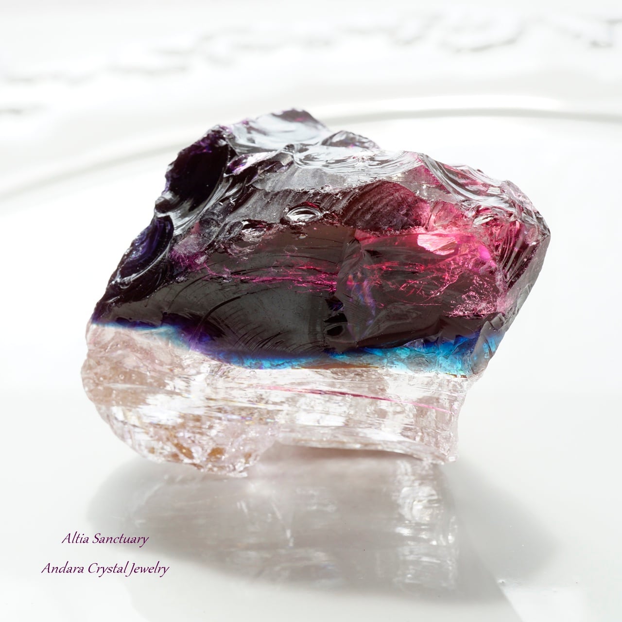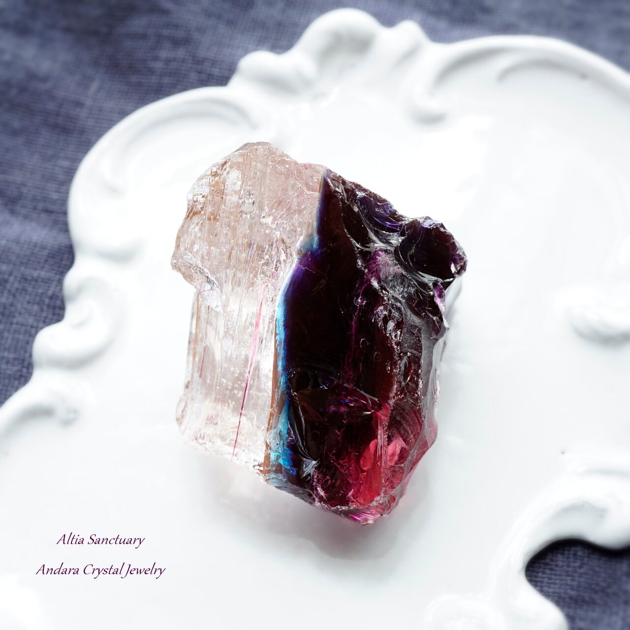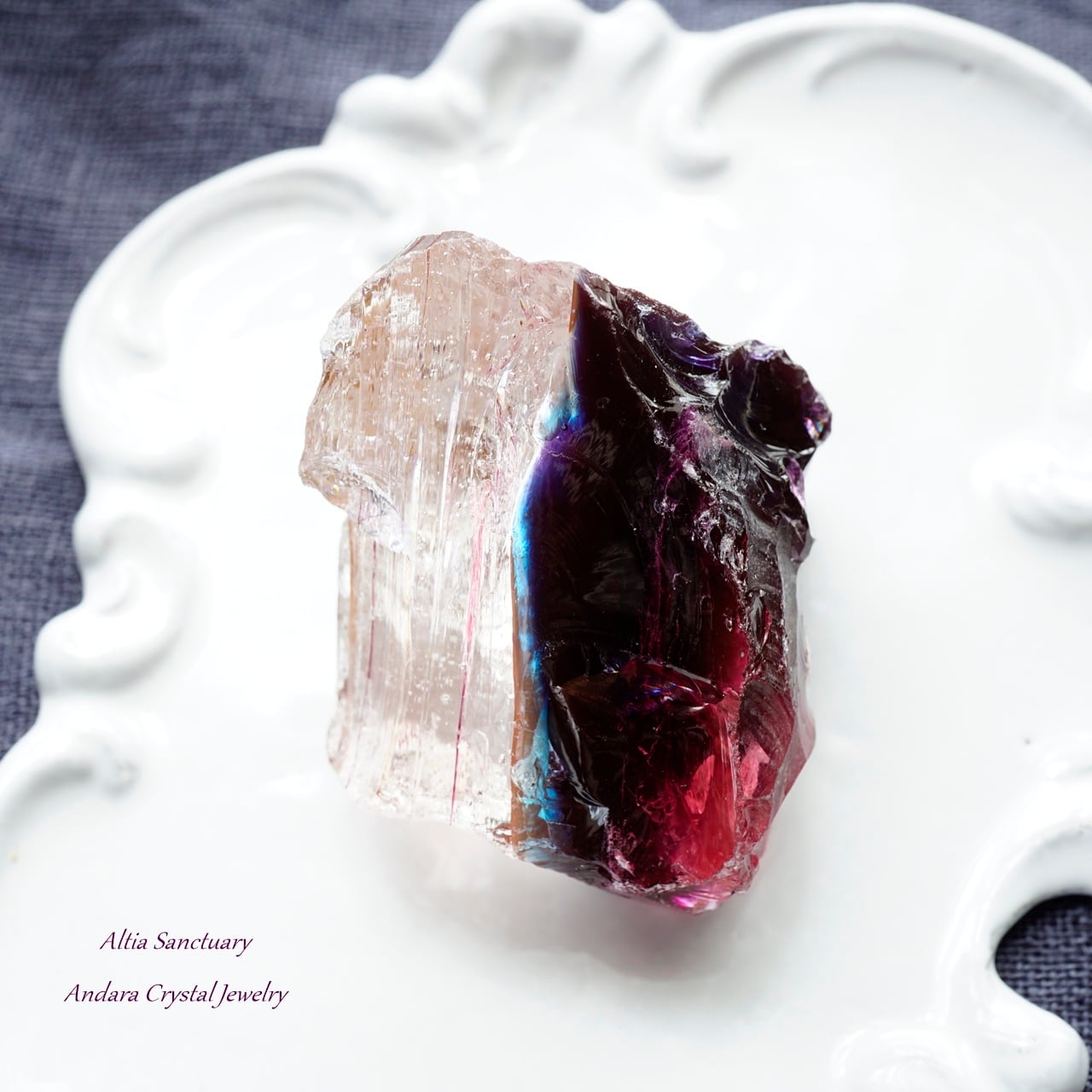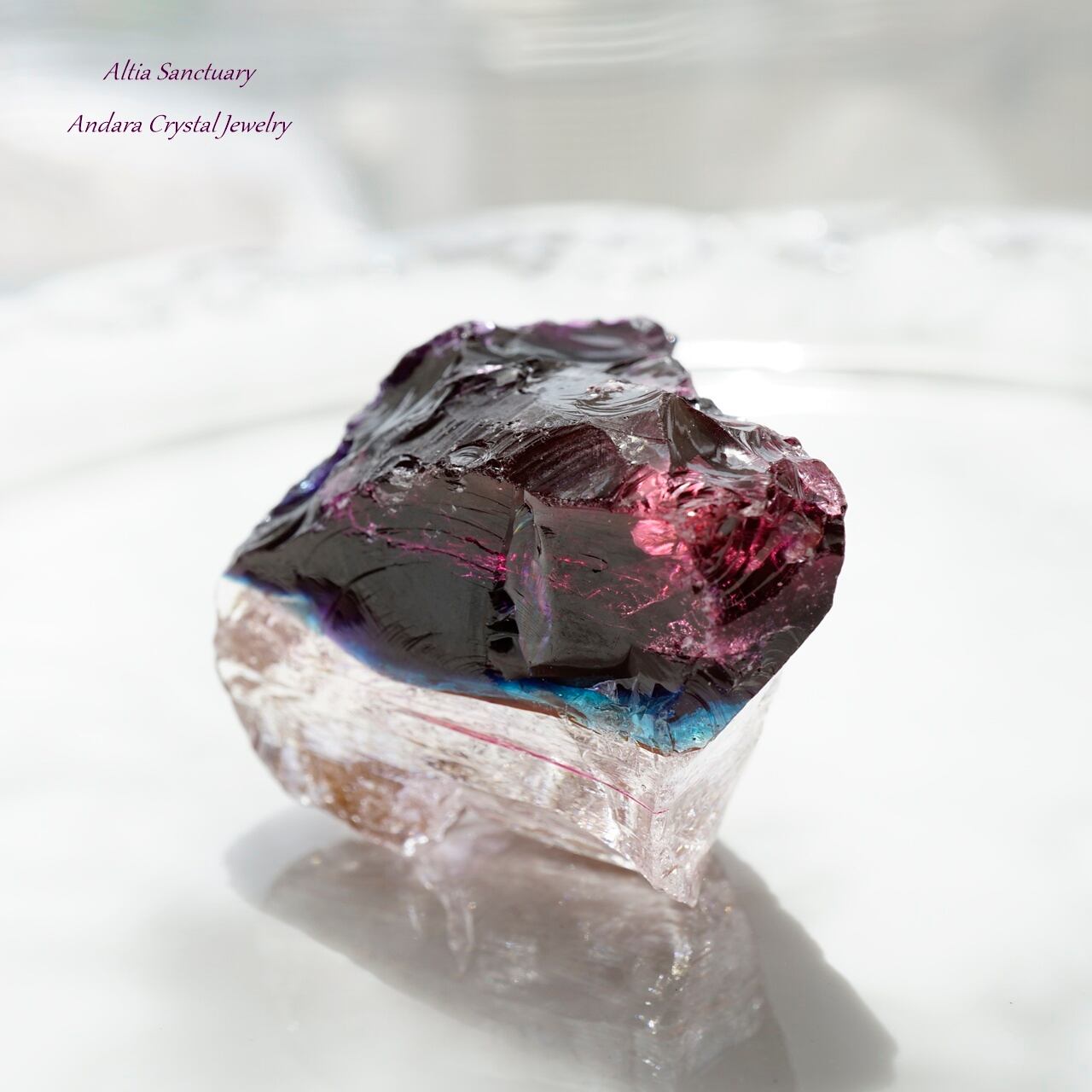 クリアーな部分には、シーフォーム(気泡)入りのコスミックアイスにソフィアやラズベリーが縞模様に内包し、ラズベリーレッドの濃い部分は、「ラズベリー」「ソフィア」「スターライトサファイア」や「ソブリンアメジスト」等、多彩な特性が含まれる美しく希少なアンダラクリスタルです。また、小さな虹が所々に見られます。