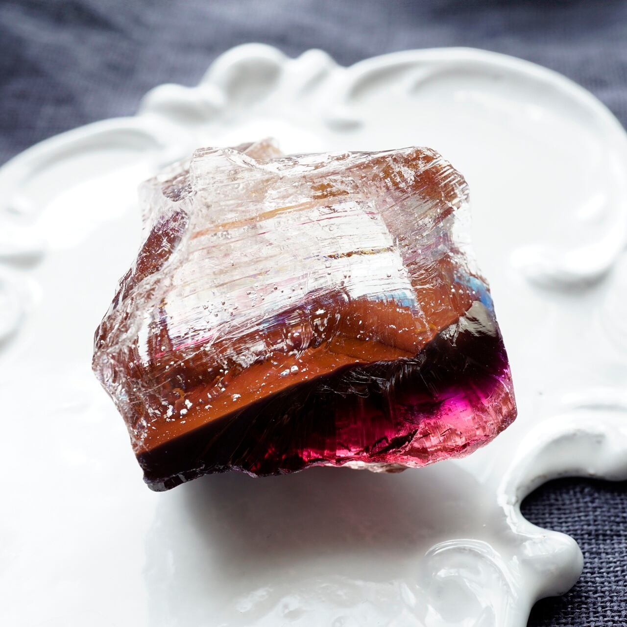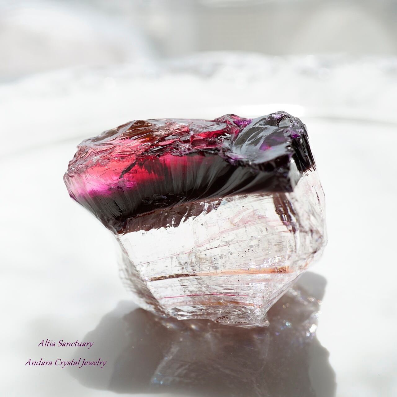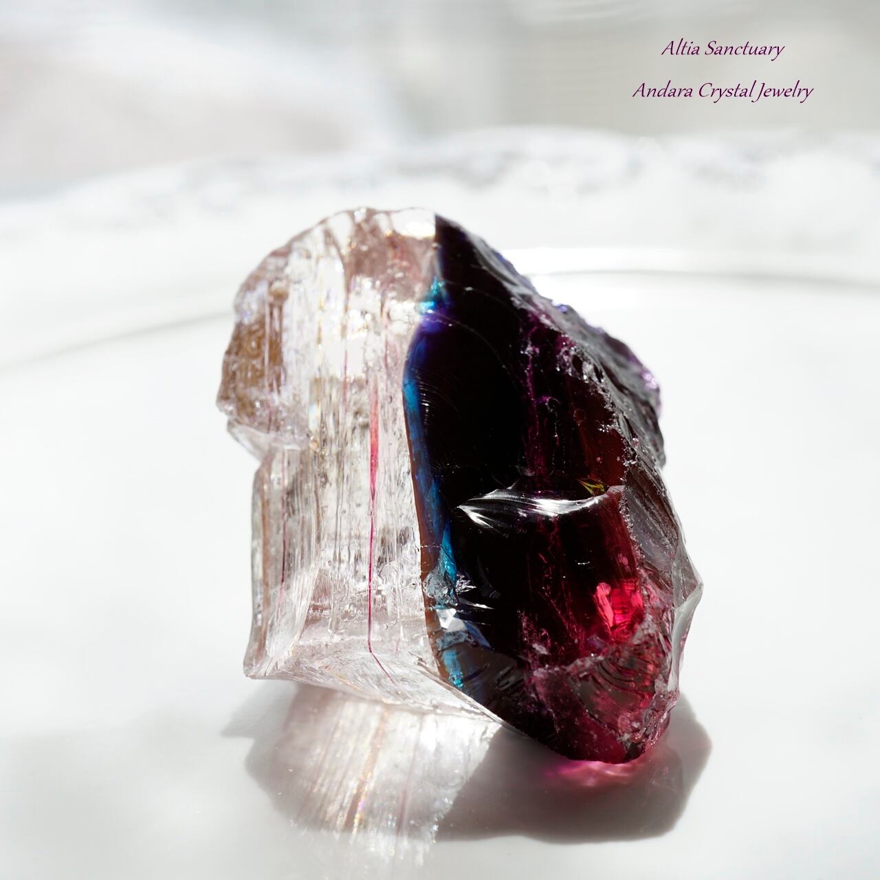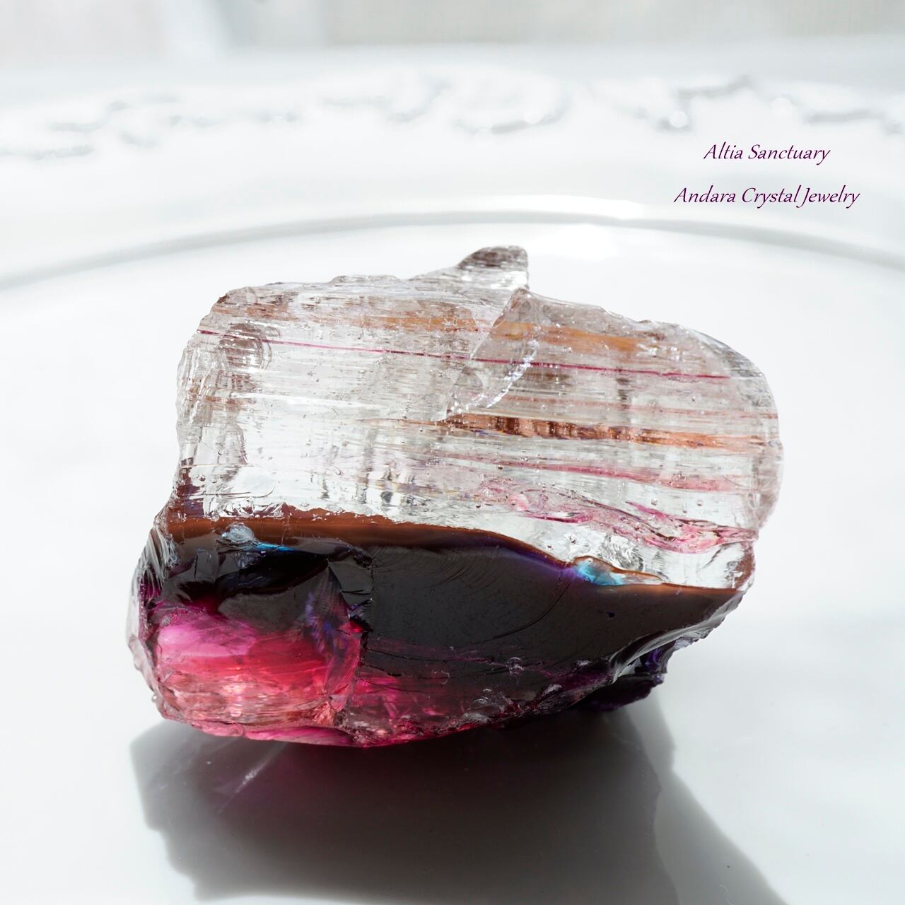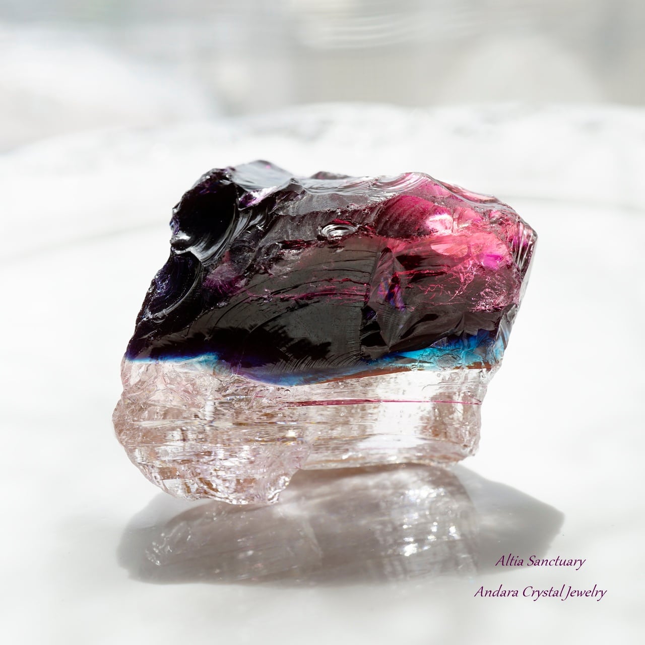 クリアーな部分には、シーフォーム(気泡)入りのコスミックアイスにソフィアやラズベリーが縞模様に内包し、ラズベリーレッドの濃い部分は、「ラズベリー」「ソフィア」「スターライトサファイア」や「ソブリンアメジスト」等、多彩な特性が含まれる美しく希少なアンダラクリスタルです。また、小さな虹が所々に見られます。