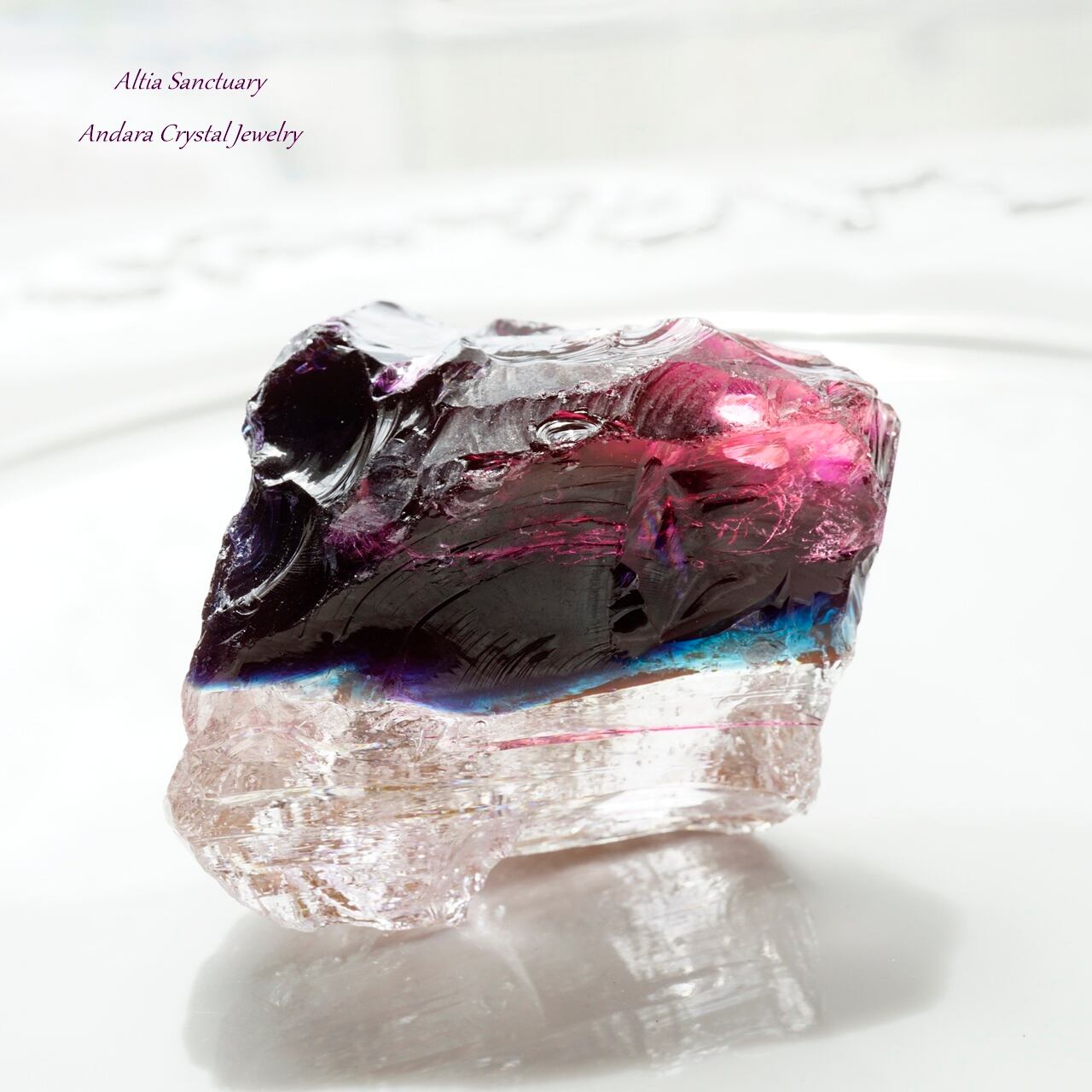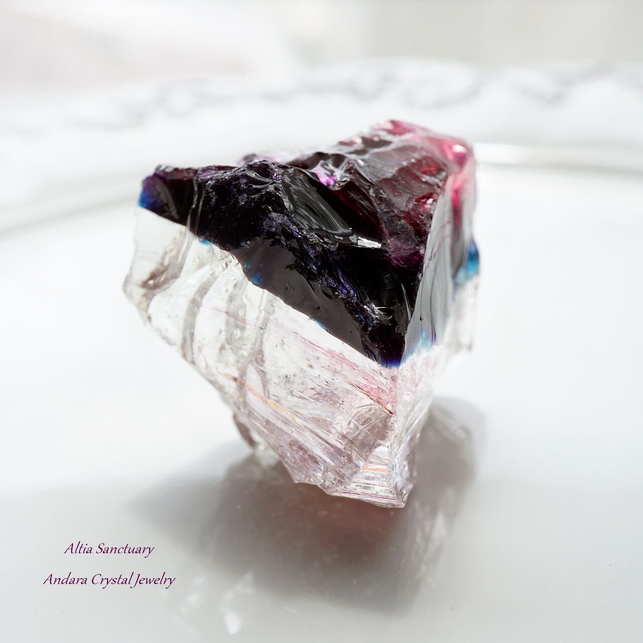 アンダラクリスタルは、黒曜石(オブシディアン)に似たガラス質で、ゴールド・シルバー・イリジウム・ロジウム・クロミニウム・プラチナなどの単原子成分が含まれており、レインボーの7色以上の美しいカラーを放つ魅力を持っています。