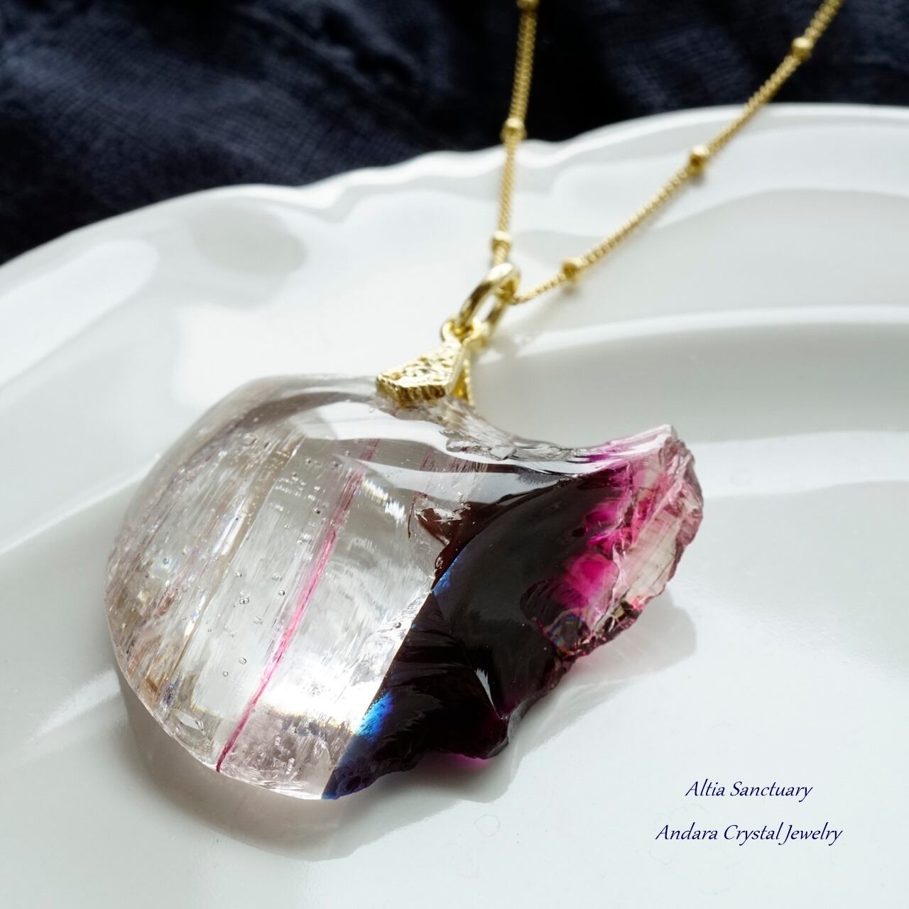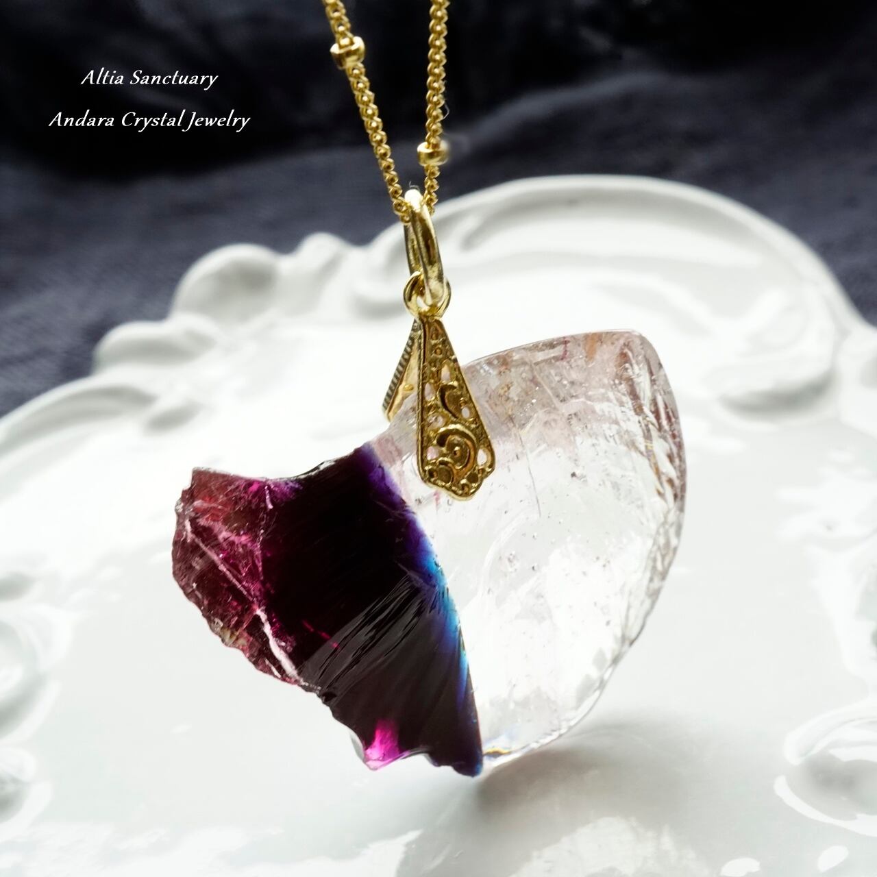 アンダラクリスタルは、黒曜石(オブシディアン)に似たガラス質で、ゴールド・シルバー・イリジウム・ロジウム・クロミニウム・プラチナなどの単原子成分が含まれており、レインボーの7色以上の美しいカラーを放つ魅力を持っています。