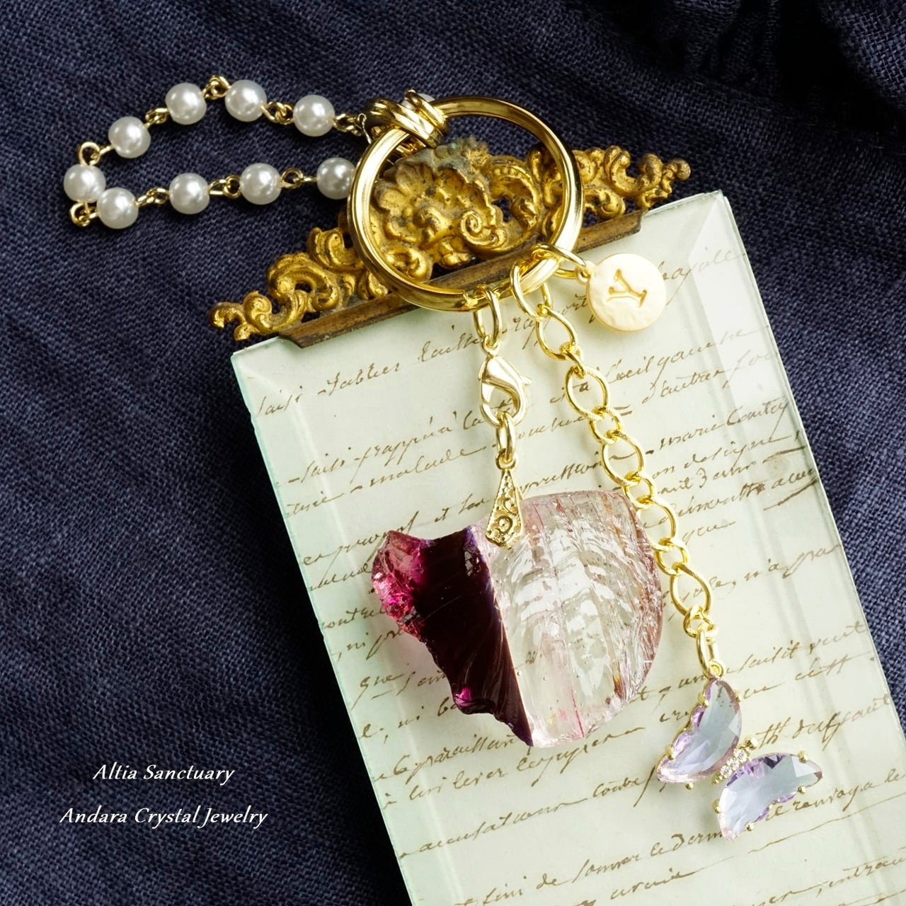 マルチレインボーのアンダラクリスタルを「羽根のような形にアレンジし、キーホルダーに」。とオーダーを頂き、こちらのマルチレインボーに合わせて、可憐な蝶の羽根のイメージでラフ研磨し、パールや蝶のチャーム、お客様のイニシャルを付けて、3Wayのバックチャームに仕立てました。