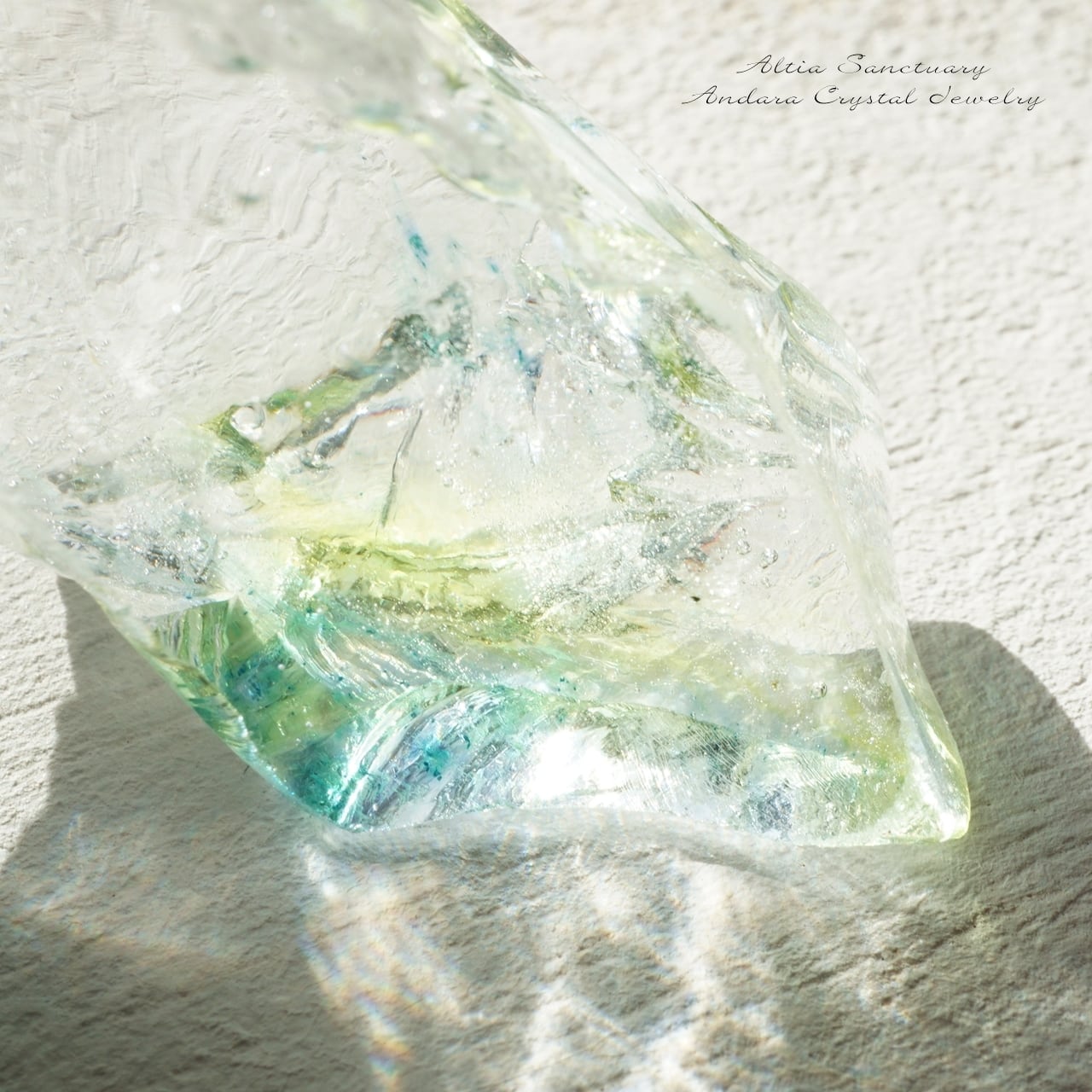 クリアなコスミックアイスにエレスチャルサファイヤとソラリスのイエローが儚げに入った希少なマルチカラーのアンダラクリスタル(シェラネバダ産)です。