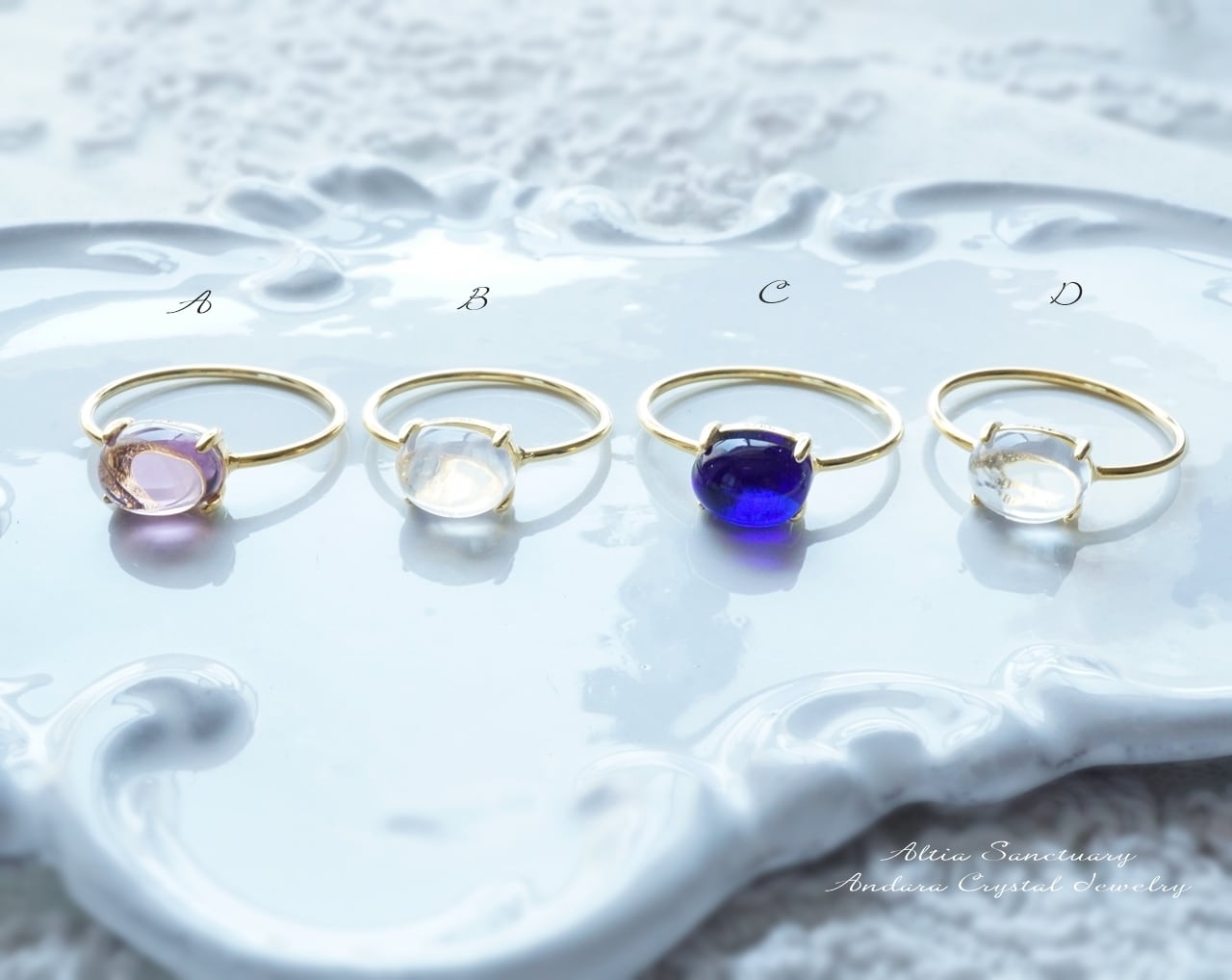 アンダラクリスタルのオーバル型カボション1粒のシンプルな爪留めリングです。