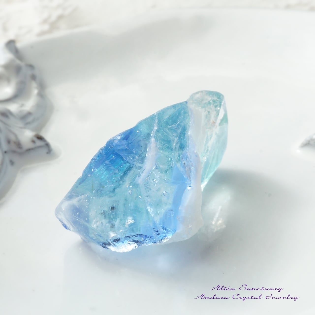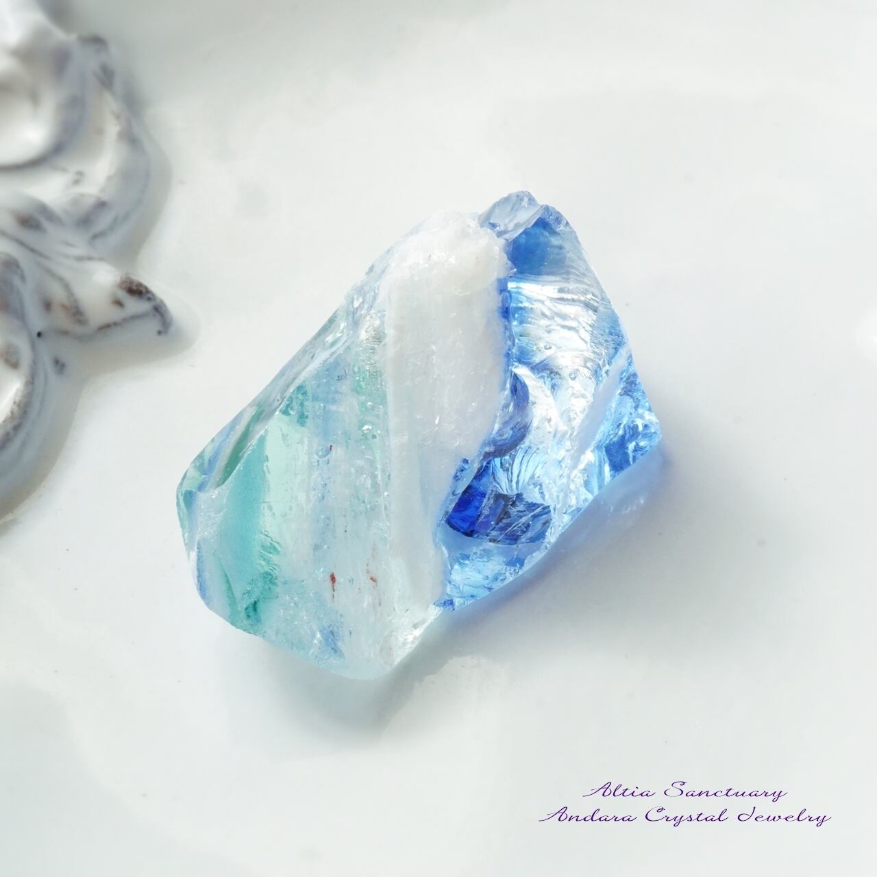 クリアなコスミックアイスにエメラルドグリーン、サファイヤブルーが層になって入り、パステルホワイトが所々に付いたマルチカラーのアンダラクリスタルです。また、微細な気泡や小さな虹が内包されたとても珍しいアンダラクリスタルになります。