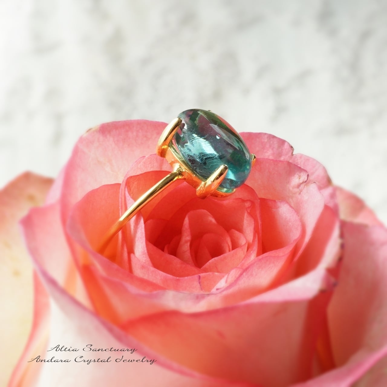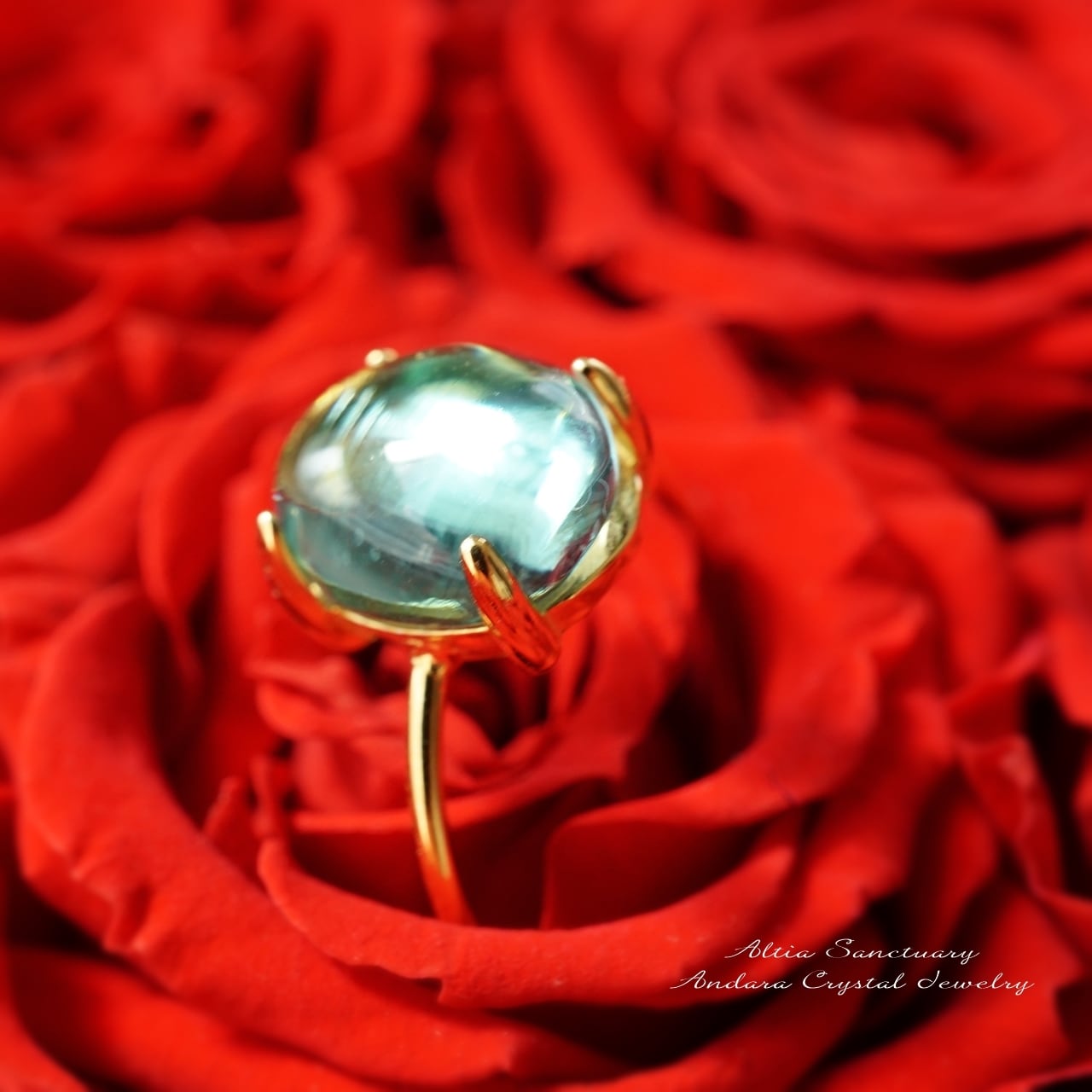 アンダラクリスタルを職人により10×8ミリの小さなオーバル形に研磨加工して頂き、Silver925製・18KGP仕上げリング(指輪)にセットいたしました。