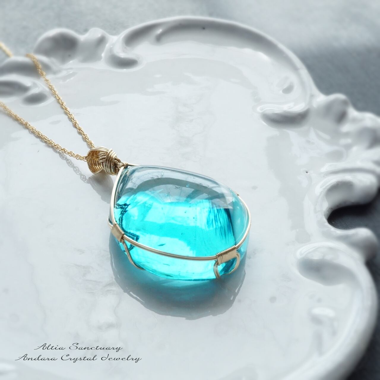 ひときわ目を惹くピーコックブルーの海のような「エレクトリックブルー」の女神巻き®ペンダントです。こちらは「パステルアイス」が付いたレアなバイカラーアンダラクリスタルで、マーキスのような雫形に研磨して頂き、女神巻き®ペンダント仕立てました。