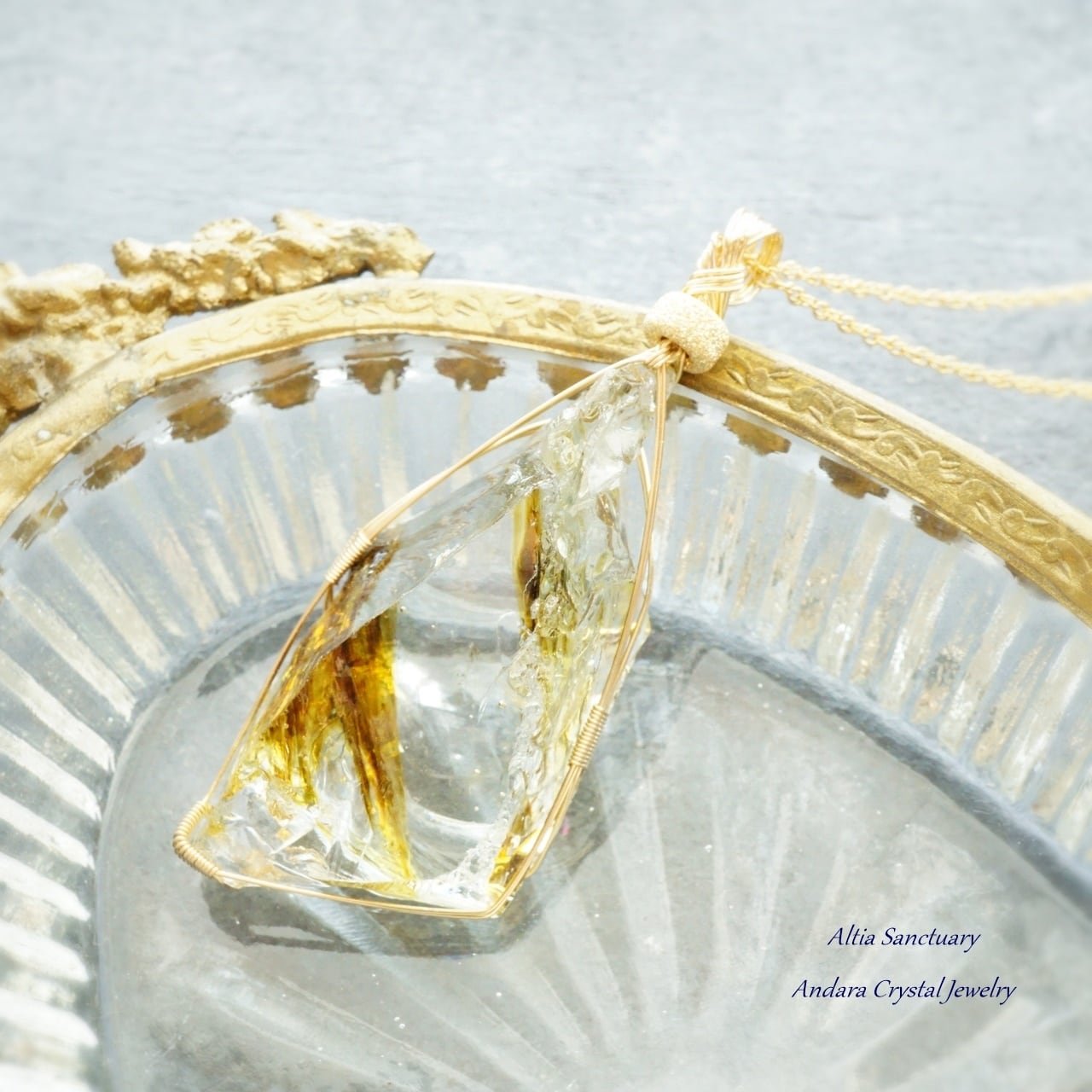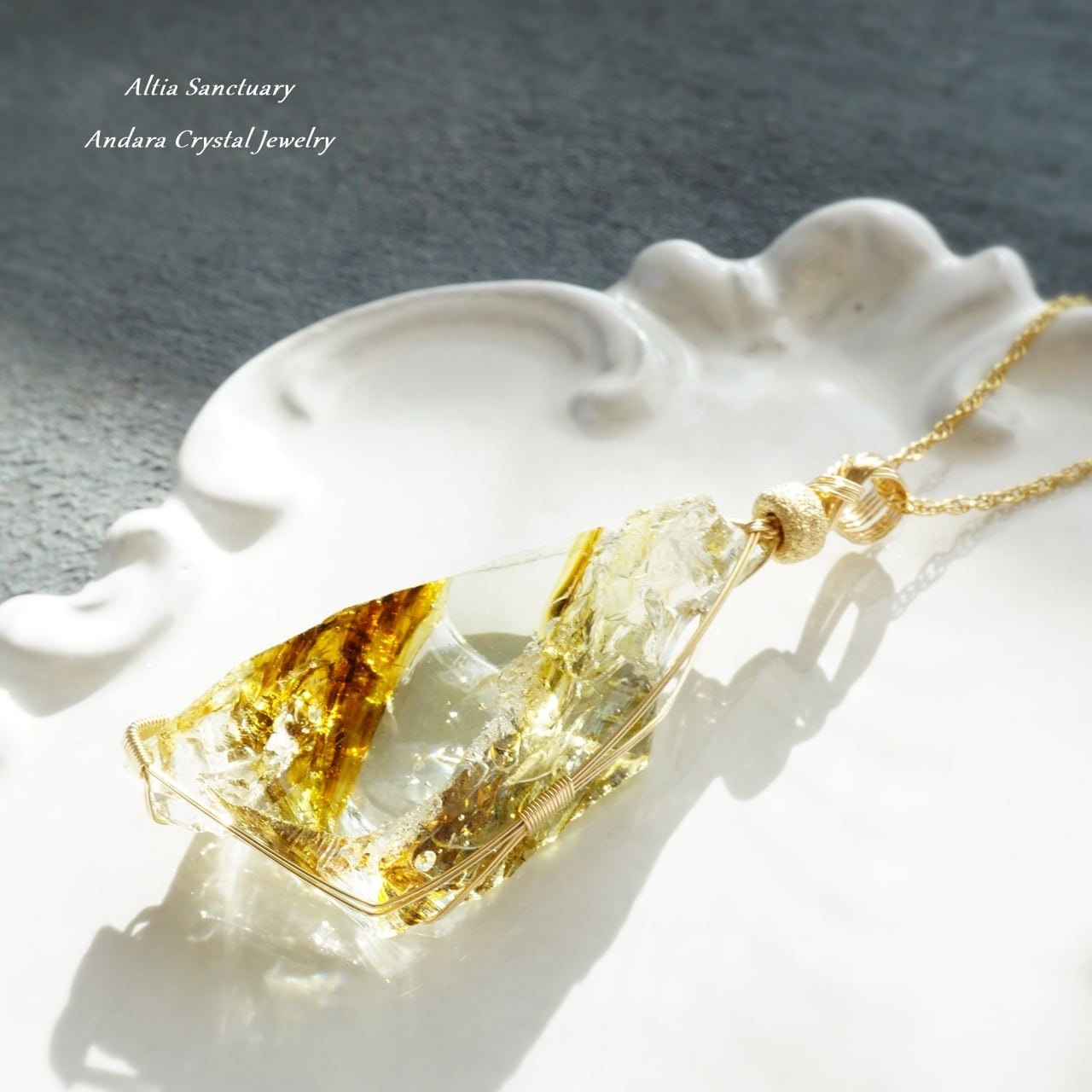 神々しいゴールドの輝きを放つアンダラクリスタルです。クリアな「コスミックアイス」に天の光「セレスチャルゴールド」、大地へグラウンディングする「アースシャーマン」のマルチカラーです。